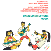 Unsere Jugendbänd sucht Unterstützung. Ob Gitarre, Klavier oder Schlagzeug – welches Instrument du auch spielst – melde dich bei uns, wenn du Lust auf ’ne Bänd hast und mit uns gemeinsam Musik machen willst. Wir treten bei Jugend-,Familien- und Konfirmationsgottesdiensten auf.
