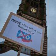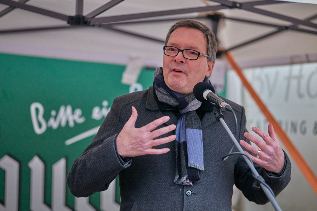 Pfarrer Müller fand eindringliche Worte. Er erinnerte daran, dass auch die Konflikte zwischen Katholiken und Protestanten überwunden worden seien. Es habe eine Zeit gegeben, da wäre es nicht denkbar gewesen, dass ein evangelischer Pfarrer vor der katholischen Kirche spricht. Wir müssen zusammenhalten und für ein Miteinander aller Menschen eintreten: „Christlicher Glaube und völkisches Denken passen nicht zusammen. Unser Kreuz hat keine Haken“ waren die eindrucksvollen Schlussworte seiner kurzen Rede.
