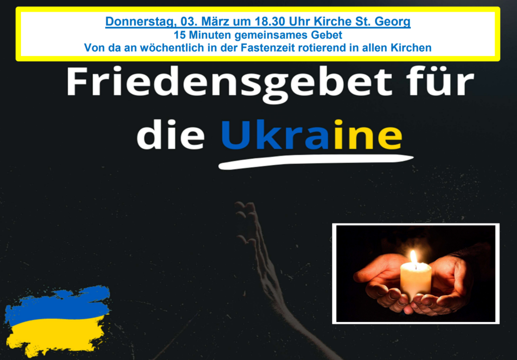 Herzliche Einladung zum Friedensgebet der katholischen Kirchengemeinde St. Matthias. 15 Minuten gemeinsames Gebet für den Frieden in der Welt und insbesondere für die Ukraine.